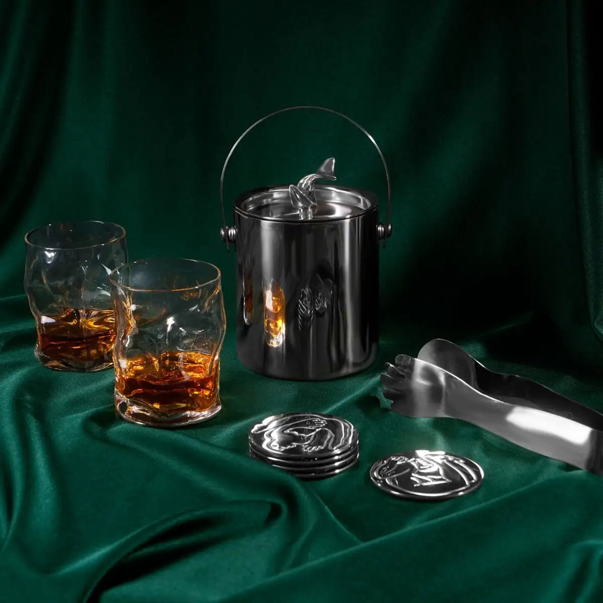 Elevate your entertaining game with our COASTER SET OF 6. These finely crafted stainless steel coasters feature intricate figures that exude elegance and sophistication. With rubber bumpers to prevent slipping, they are both functional and stylish. A must-have for any luxury home.
